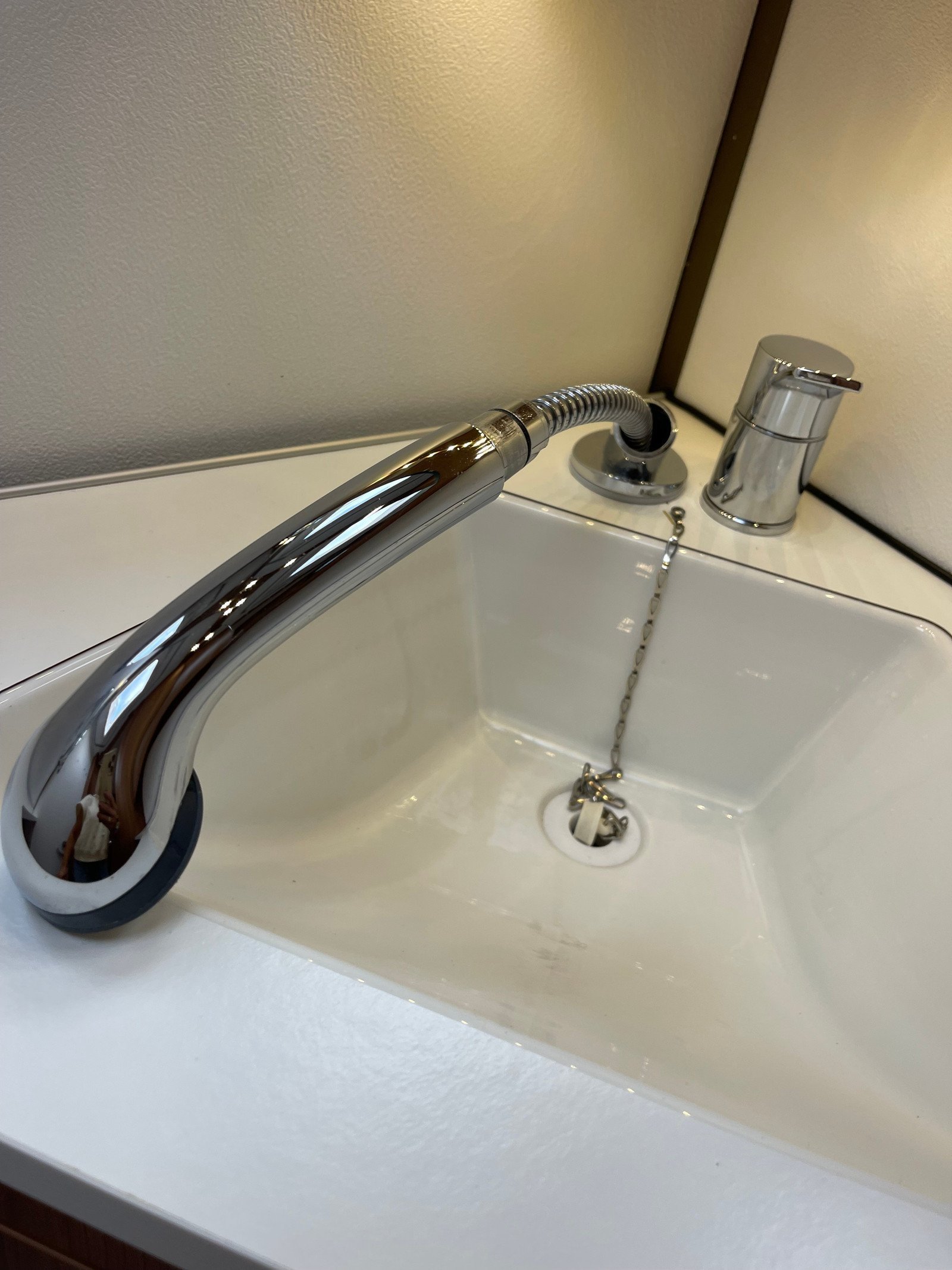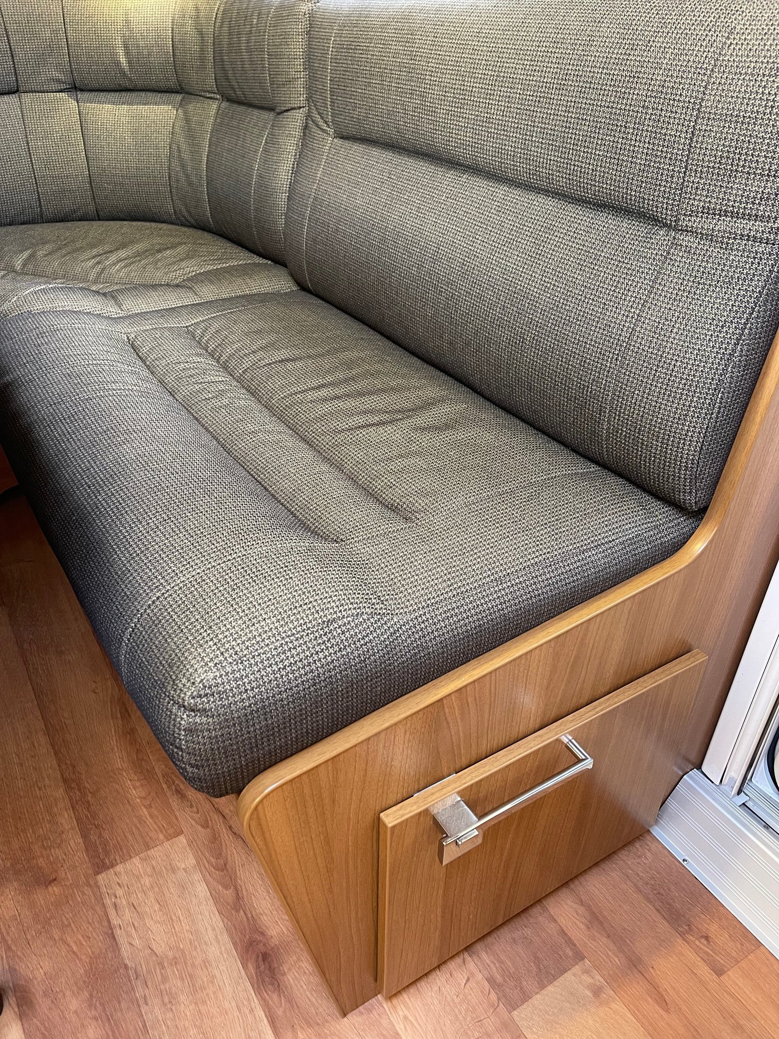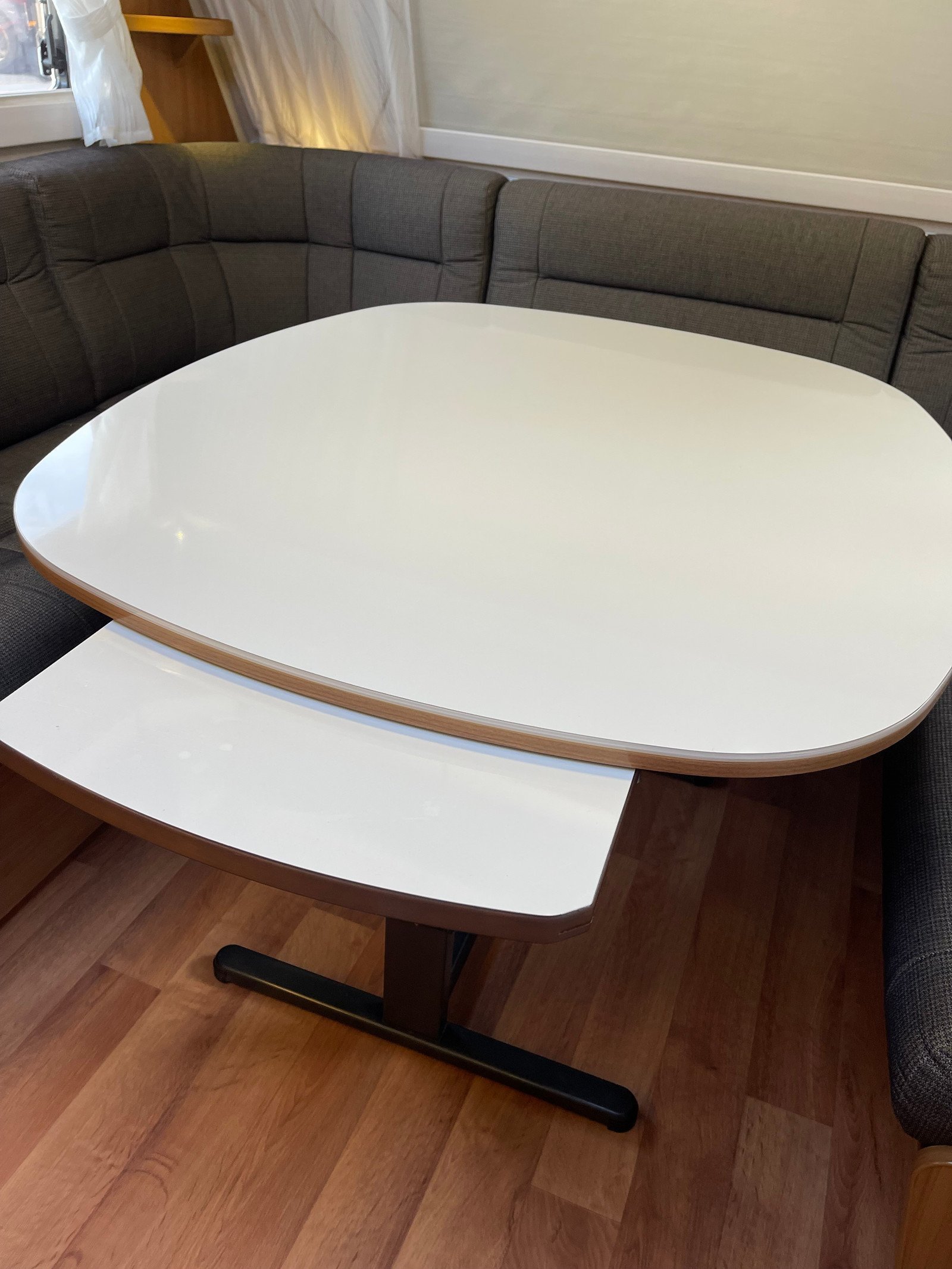 Caravane spacieuse adaptée à une utilisation hivernale comme estivale. Grand séjour circulaire à l’avant suivi d’une cuisine avec 3 plaques électriques et évier.