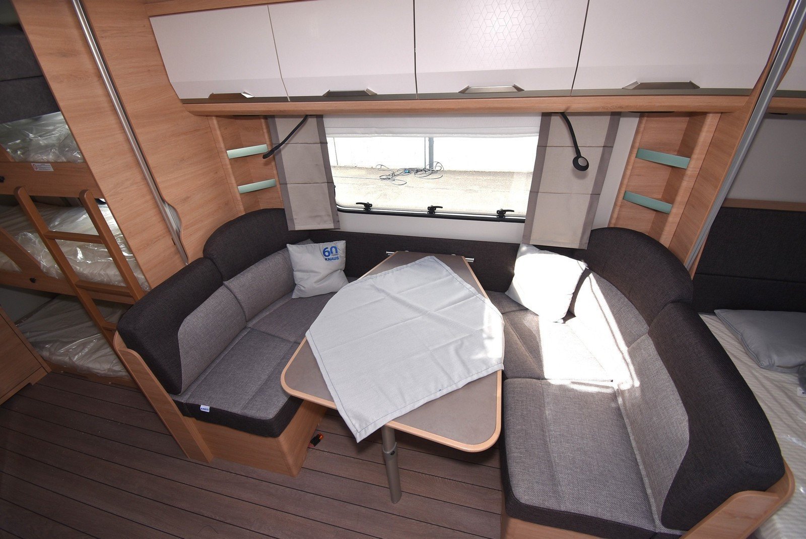 Couchette triple pour les enfants et lit double fixe. Vous pouvez également poser une table dans le coin salon et bénéficier de 2 couchages supplémentaires.