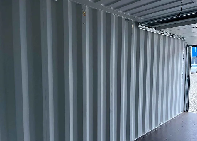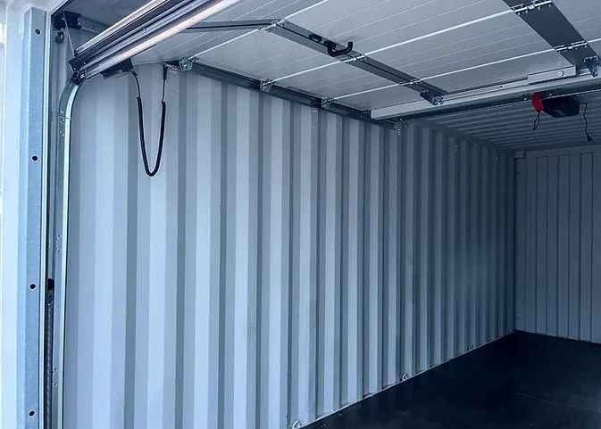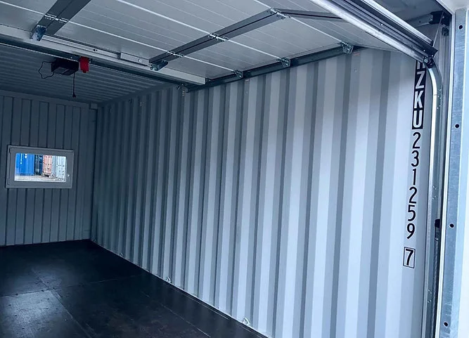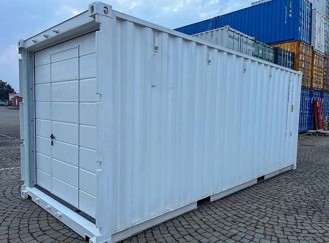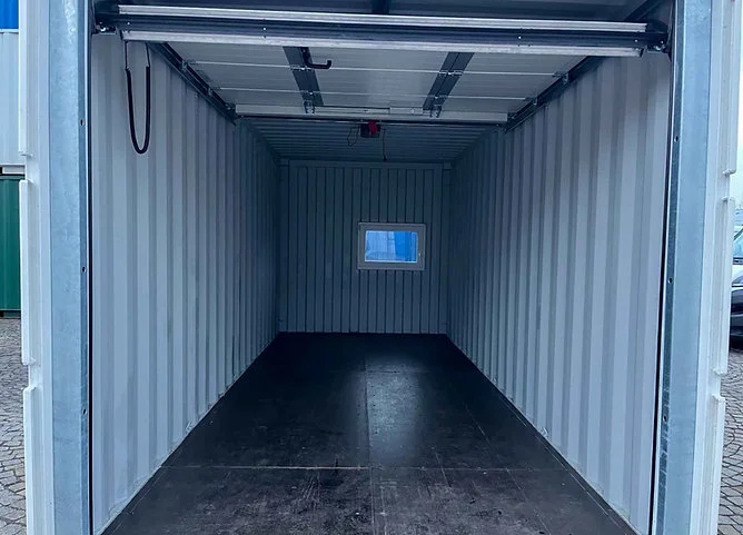Conteneur maritime de 20 pieds, peint en blanc pur RAL 9010, équipé d’une porte sectionnelle Hörmann motorisée, d’une porte d’entrée standard et d’une fenêtre en PVC. Idéal pour une utilisation comme bureau, atelier ou espace de stockage sécurisé. Grâce à ses modifications, il offre un confort optimal tout en garantissant robustesse et résistance aux intempéries.
