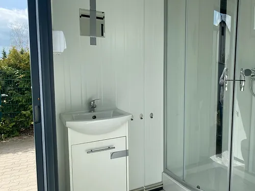 Notre Conteneur sanitaire complet 2×2 mètres, est un module sanitaire disposant d’un Wc, un lavabo avec meuble bas, et d’une cabine de douche. Avec une fenêtre d’aération et un chauffage.